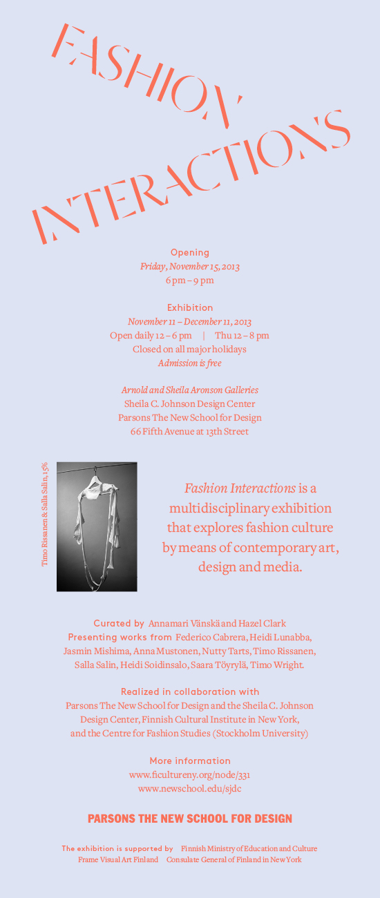 Fashion Interactions is produced by Parsons The New School for Design, the Sheila C. Johnson Design Center at Parsons, and the Finnish Cultural Institute in New York, in collaboration with the Centre for Fashion Studies (Stockholm University). The exhibition and symposium are supported by the Finnish Ministry of Education and Culture, and Frame Visual Art Finland. 15% is supported by School of Fashion at Parsons, and City Sewing in New York.